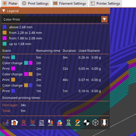 PrusaSlicer simplifies your workflow by providing time estimates for each color change you incorporate into your project. When you add one or more color changes, the Platter legend will switch to "Color Print" mode, displaying estimated completion times for each change. Alternatively, you can manually switch to this mode using the "View" select box located in the bottom left corner. This feature enables you to plan precisely when to check on your printer and execute the color change seamlessly.